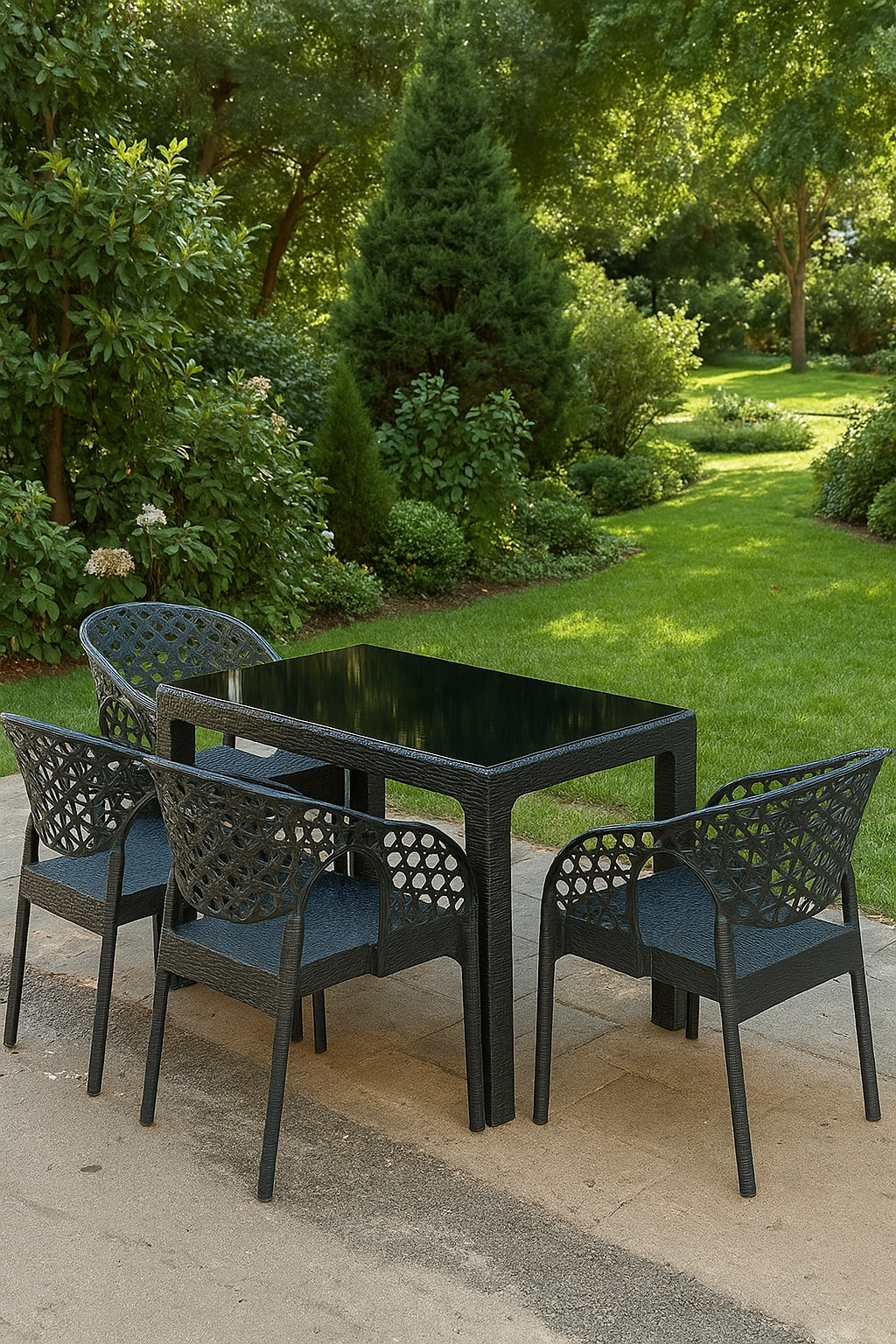 Dayanıklı rattan görünümlü iskelet, siyah cam masa yüzeyi ve konforlu oturumuyla estetiği dış mekana taşıyın.